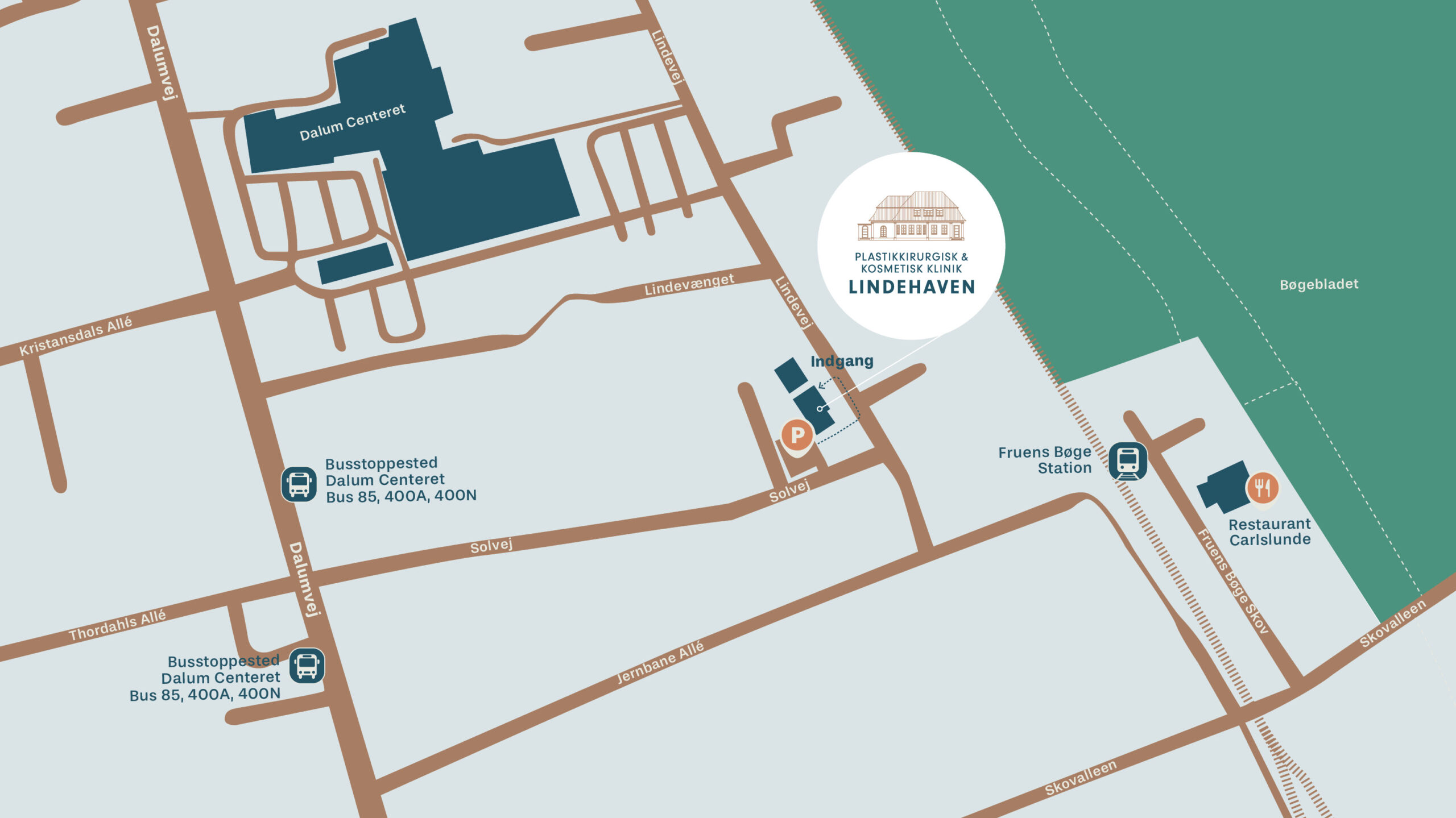 Lindehaven ligger fredeligt placeret på Lindevej 65 i Odense SV – i et roligt villakvarter tæt ved skov, å og station. Klinikken er let at finde, uanset om du kommer i bil, med tog eller på cykel.